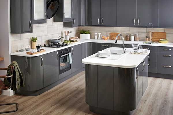 Our Santini Gloss Anthracite Slab Kitchen Is Bold And Dramatic Softened By Design Led Curves Curves Add A Soft Curved Kitchen Modern Kitchen Kitchen Fittings